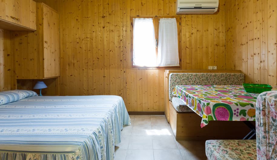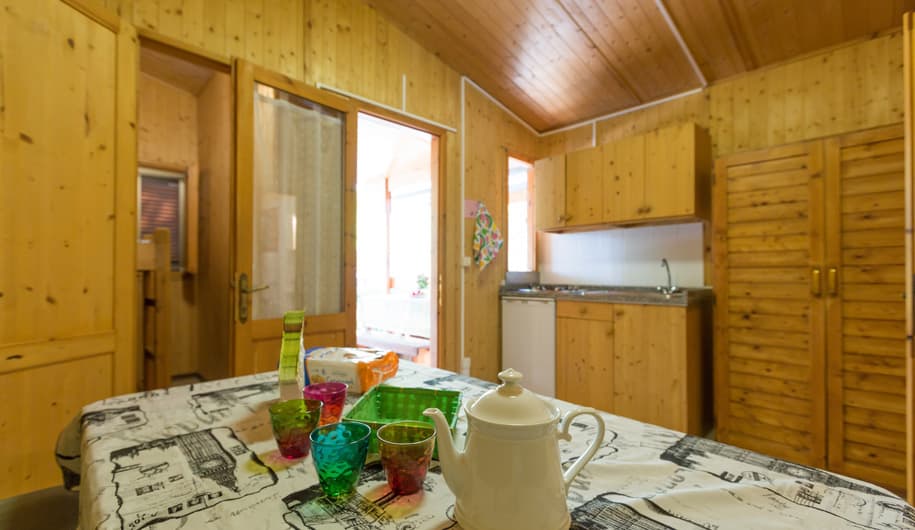 3. Chalet 6 Posti: 40MQ – Camera matrimoniale, camera con due letti a castello, bagno, cucina, veranda.
