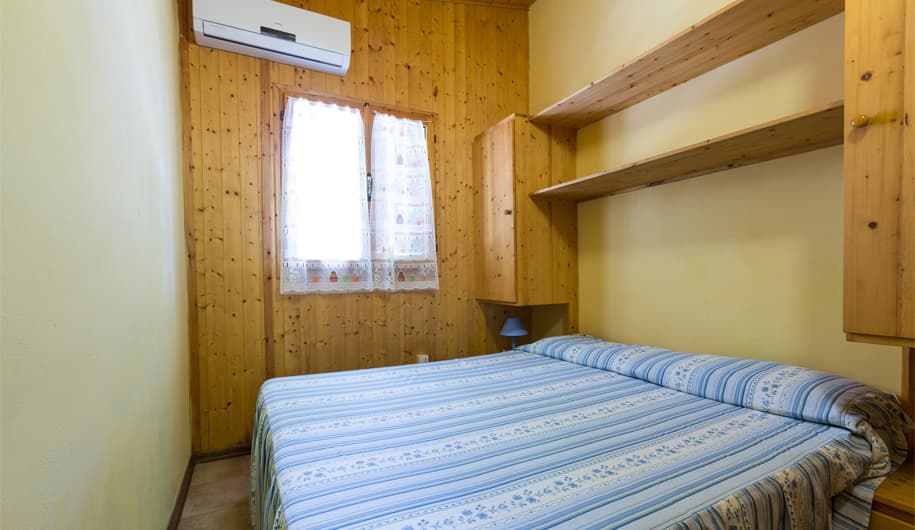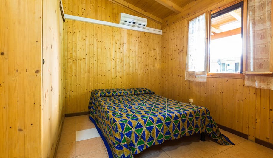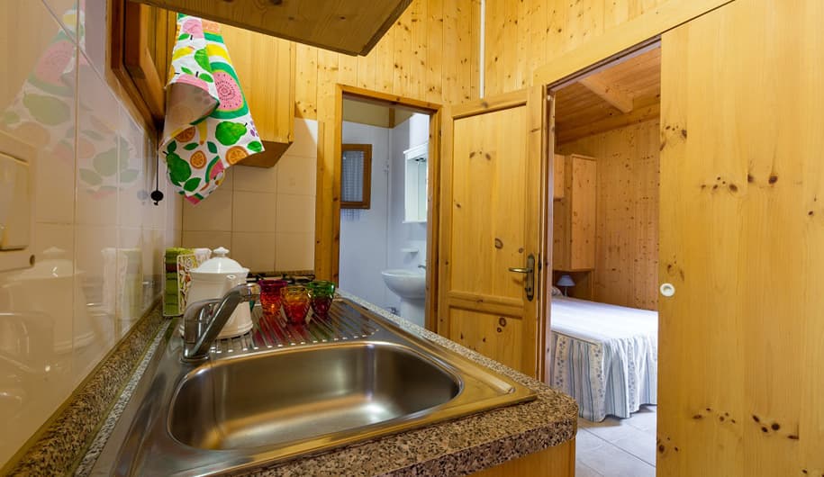1. Chalet 2 Posti: 24MQ – Camera matrimoniale con letto alla francese, bagno, angolo cottura, veranda.
