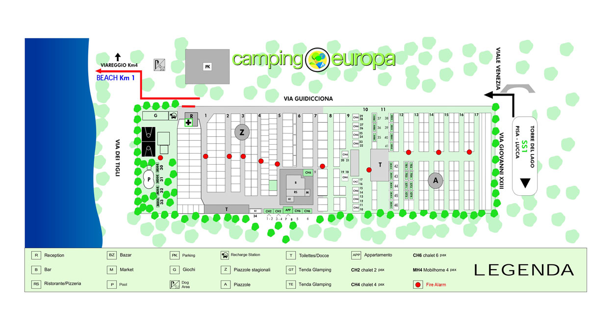 Our camping pitches are located within a grove of trees in the area between street 12 and 17 marked by evergreen hedges with good shade. They have electricity (6 amps) and fountains located in different areas. Free parking is available in the camping pitch. There are three different sizes of pitches to accommodate those who travel in a small tent, trailer, or camper: mini, standard, or maxi.